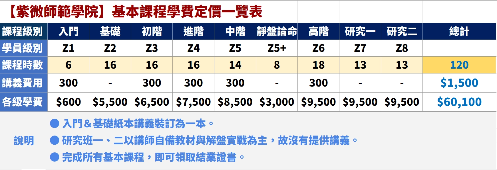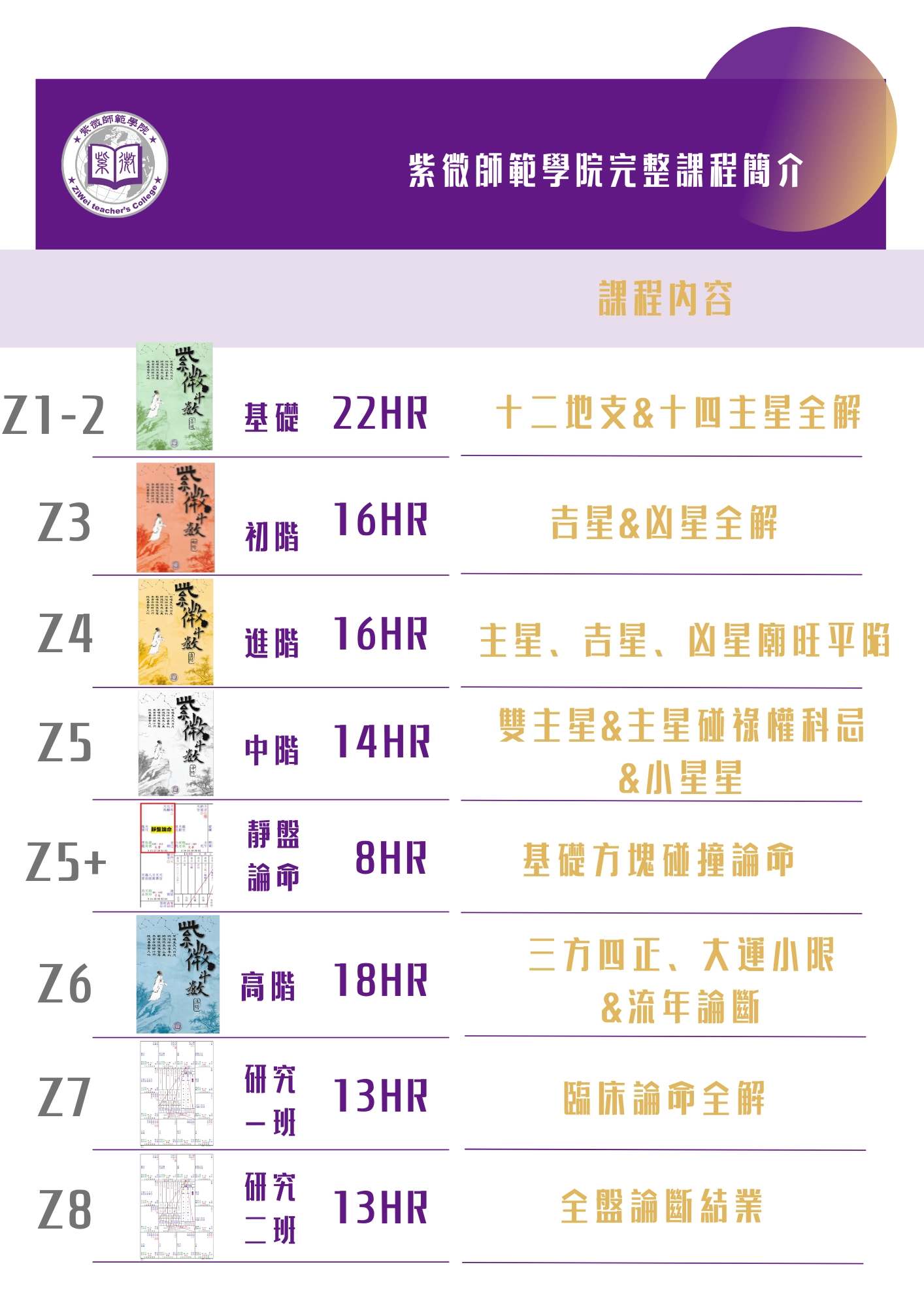 問答請問《紫微斗數新手專班》還有其他時段與老師嗎?有的。請參見本期《新手專班》一覽請問《紫微斗數新手專班》有幾種上課方式?學院有兩種上課方式,實體與線上直播。每班採用方式皆不同,詳見課程標題說明請問《紫微斗數新手專班》會提供講義嗎?會的。實體班提供紙本講義,線上班提供電子講義。